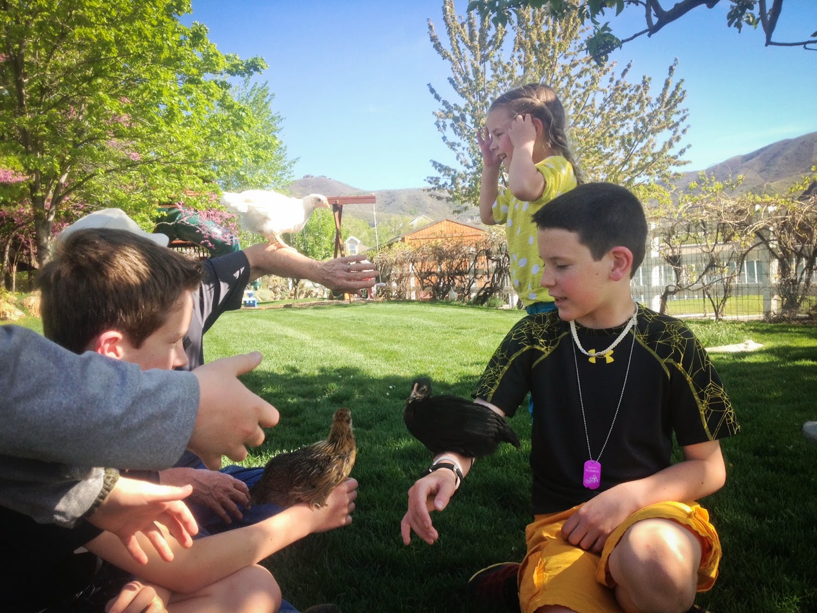We got to meet Grandma Vicki's new chickens (a dog got into the chicken coop earlier this year and that was the end of most of her chickens). The weather had us all smiling.